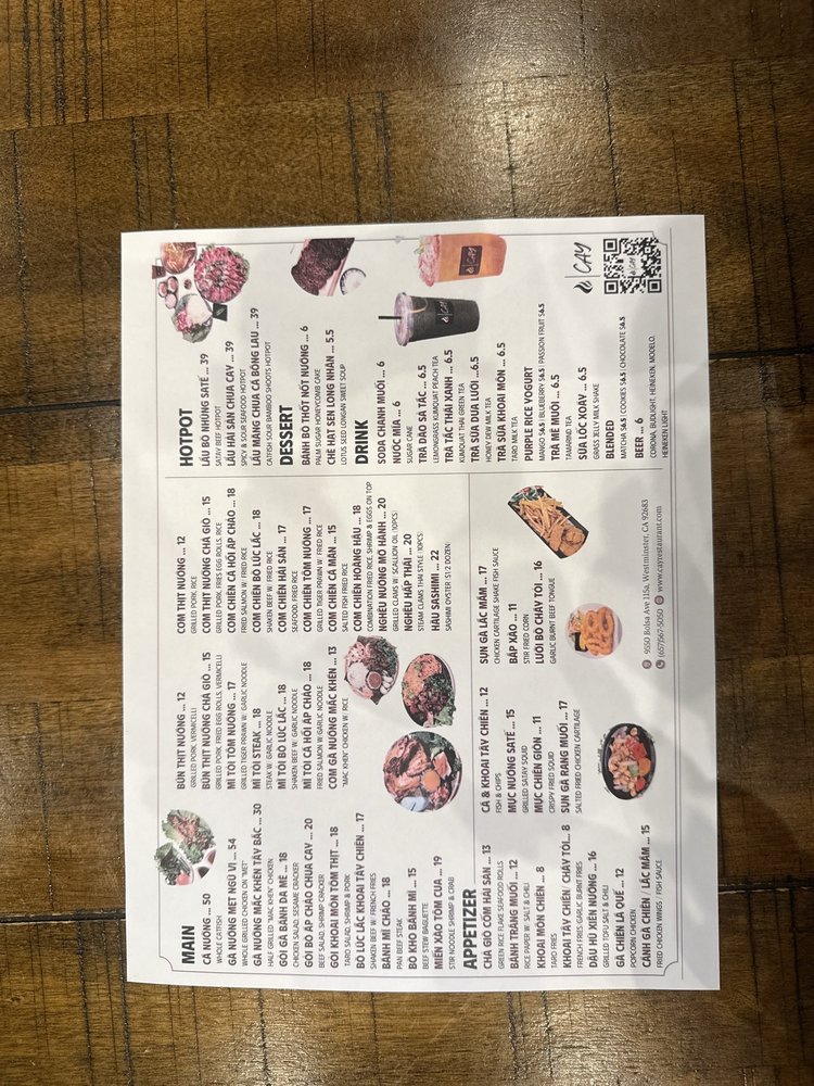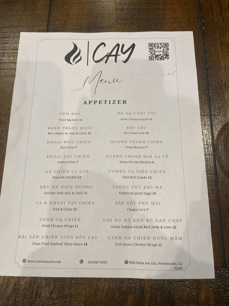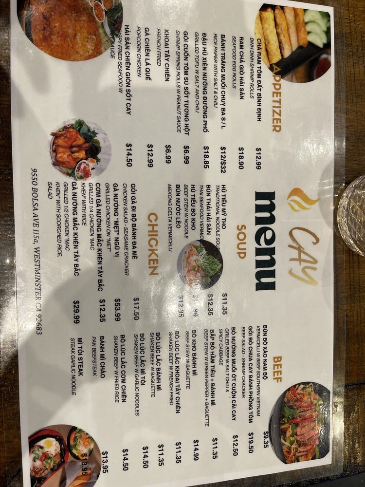 Welcome to CAY, a vibrant haven for Asian fusion dining located at 9550 Bolsa Ave Ste #115A, Westminster, CA. Embracing the exquisite flavors of Vietnamese cuisine, CAY offers a diverse menu that caters to every palate. Signature dishes like Muc Nuong Sa Te (grilled satay squid) and Ga Nuong Mac Khen (half roasted chicken) highlight the restaurant's commitment to authentic taste.